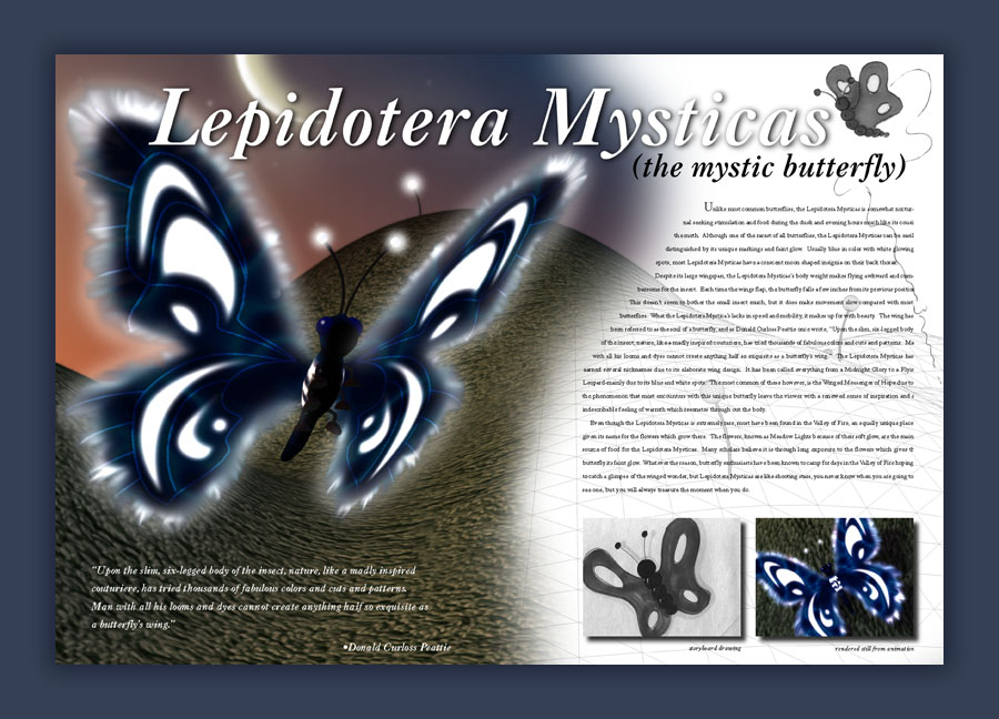 Unlike most common butterflies, the Lepidotera Mysticas is somewhat noctural seeking stimulation and food during the dusk and evening hours much like its cousin the moth. Although one of the rarest of all butterflies, the Lepidotera Mysticas can be easily distinguished by its unique markings and faint glow. Usually blue in color with white glowing spots, most Lepidotera Mysticas have a crescent moon shaped insignia on their back thorax. Despite its large wingspan, the Lepidotera Mysticas's body weight makes flying awkward and cumbersome for the insect. Each time the wings flap, the butterfly falls a few inches from its previous position. This doesn't seem to bother the small insect much, but it does make movement slow compared with most butterflies. What the Lepidotera Mysticas lacks in speed and mobility, it makes up for with beauty The wing has been referred to as the sould of a butterfly, and as Donald Curloss peattie once wrote, "Upon the slim, six-legged body of the insect, nature, lake a madly inspired couturiere, has tried thousands of fabulous colors and cuts and patterns. Man with all his looms and dyes cannot create anything half so exquisite as a butterfly's wing." The Lepidotera Mysticas has earned several nicknames due to its elaborate wing design. It has been called everything from a Midnight Glory to a Flying Leopard-mainly due to its blue and white spots. Th most common of these however, is the Winged Messanger of Hope due to the phenomenon that most encounters with this unique butterfly leave the viewer with a renewed sense of inspiration and an indescribable feeling of warmth which resonates through out the body.